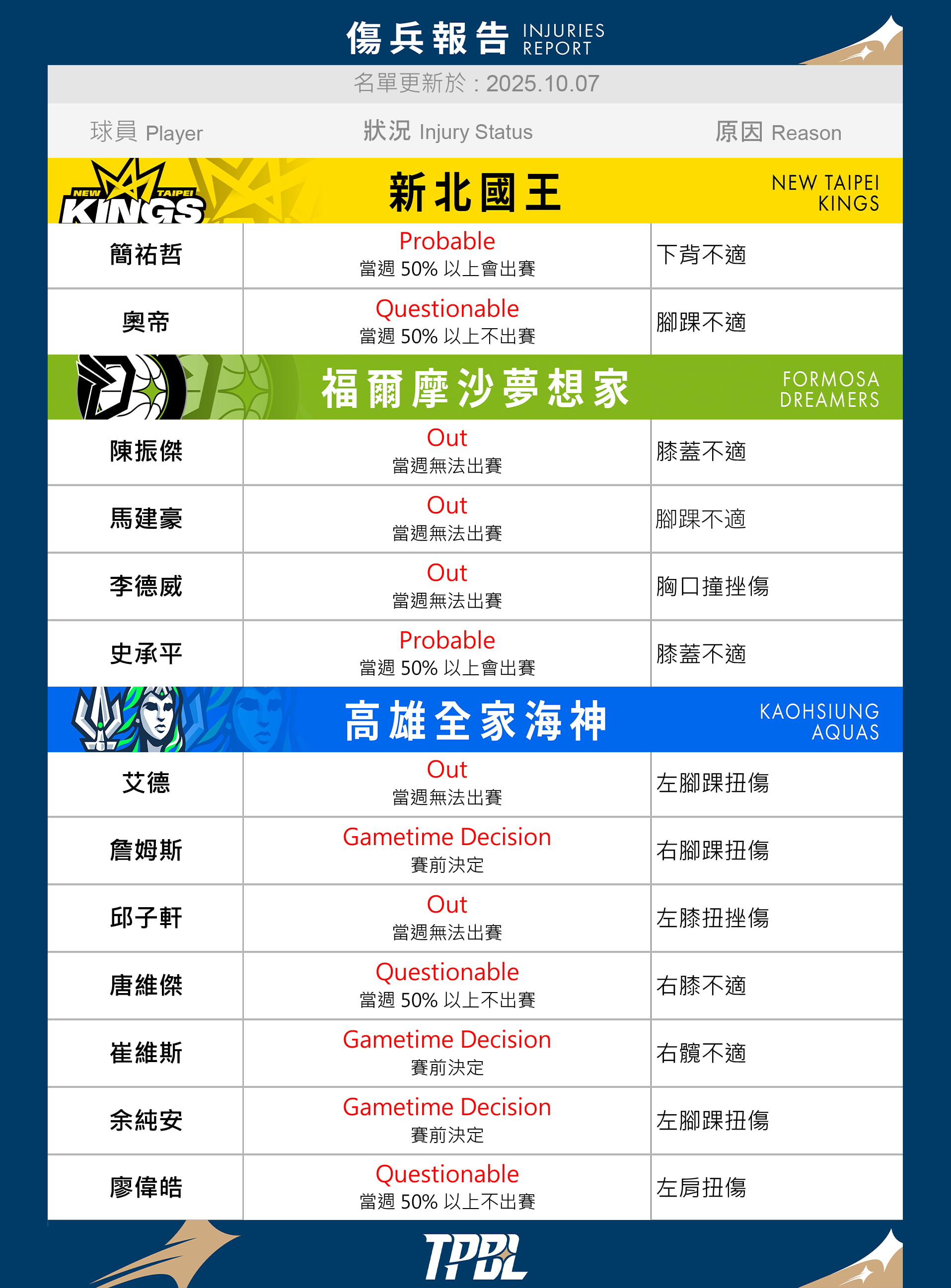 2025/10/07傷兵報告|每週一固定更新10/11 - 10/12 傷兵報告10/11-10/12 Week 1 傷兵報告 回上一頁 Related News相關新聞本土陣容大戰由海神勝出 國王末節逆轉雲豹 TPBL季前熱身賽落幕 開幕戰10/11登場2025-10-05聯盟快訊TPBL季前熱身賽戰況火熱!戰神上演逆轉秀、阿巴西狂砍30分、夢想家十人應戰收二連勝2025-10-04聯盟快訊TPBL 季前熱身賽首日雙戰落幕 夢想家、攻城獅分別取勝2025-10-03聯盟快訊【一百種喜歡籃球的原因 Vol. 005】馬建豪:因為不服輸,所以從未停下腳步2025-09-28Beyond Basketball|球員故事TPBL裁判季前培訓已於九月啟動 專業養成迎接新賽季2025-09-28聯盟快訊TPBL 新賽季正式啟動 「籃球,怎能不愛」傳遞初心熱情2025-09-25聯盟快訊本土陣容大戰由海神勝出 國王末節逆轉雲豹 TPBL季前熱身賽落幕 開幕戰10/11登場2025-10-05聯盟快訊TPBL季前熱身賽戰況火熱!戰神上演逆轉秀、阿巴西狂砍30分、夢想家十人應戰收二連勝2025-10-04聯盟快訊TPBL 季前熱身賽首日雙戰落幕 夢想家、攻城獅分別取勝2025-10-03聯盟快訊【一百種喜歡籃球的原因 Vol. 005】馬建豪:因為不服輸,所以從未停下腳步2025-09-28Beyond Basketball|球員故事TPBL裁判季前培訓已於九月啟動 專業養成迎接新賽季2025-09-28聯盟快訊TPBL 新賽季正式啟動 「籃球,怎能不愛」傳遞初心熱情2025-09-25聯盟快訊
