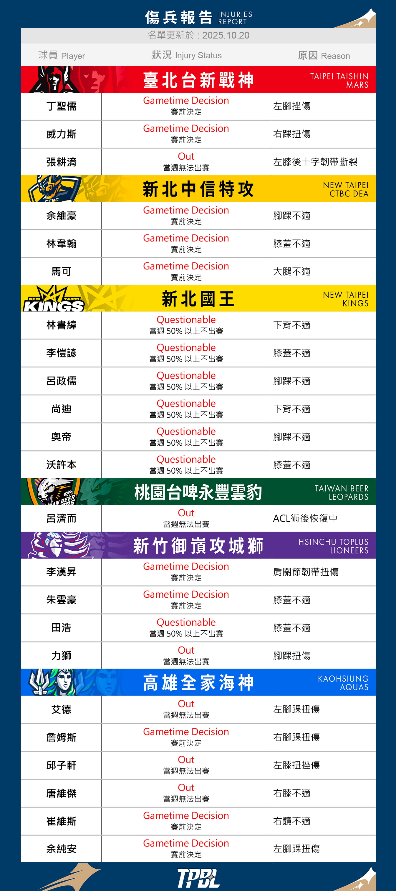 2025/10/20傷兵報告|每週一固定更新10/25 - 10/26 傷兵報告10/25-10/26 Week 3 傷兵報告 回上一頁 Related News相關新聞【一百種喜歡籃球的原因 Vol. 008】林彥廷:浪不一定要翻,但要一直往前2025-10-18Beyond Basketball|球員故事【一百種喜歡籃球的原因 Vol. 007】蔣淯安用責任與勇氣寫下屬於家的節奏2025-10-17Beyond Basketball|球員故事10/18 - 10/19 傷兵報告2025-10-13傷兵報告|每週一固定更新【一百種喜歡籃球的原因 Vol. 006】喬納森為籃球而生,為家人而戰2025-10-10Beyond Basketball|球員故事10/11 - 10/12 傷兵報告2025-10-07傷兵報告|每週一固定更新本土陣容大戰由海神勝出 國王末節逆轉雲豹 TPBL季前熱身賽落幕 開幕戰10/11登場2025-10-05聯盟快訊【一百種喜歡籃球的原因 Vol. 008】林彥廷:浪不一定要翻,但要一直往前2025-10-18Beyond Basketball|球員故事【一百種喜歡籃球的原因 Vol. 007】蔣淯安用責任與勇氣寫下屬於家的節奏2025-10-17Beyond Basketball|球員故事10/18 - 10/19 傷兵報告2025-10-13傷兵報告|每週一固定更新【一百種喜歡籃球的原因 Vol. 006】喬納森為籃球而生,為家人而戰2025-10-10Beyond Basketball|球員故事10/11 - 10/12 傷兵報告2025-10-07傷兵報告|每週一固定更新本土陣容大戰由海神勝出 國王末節逆轉雲豹 TPBL季前熱身賽落幕 開幕戰10/11登場2025-10-05聯盟快訊