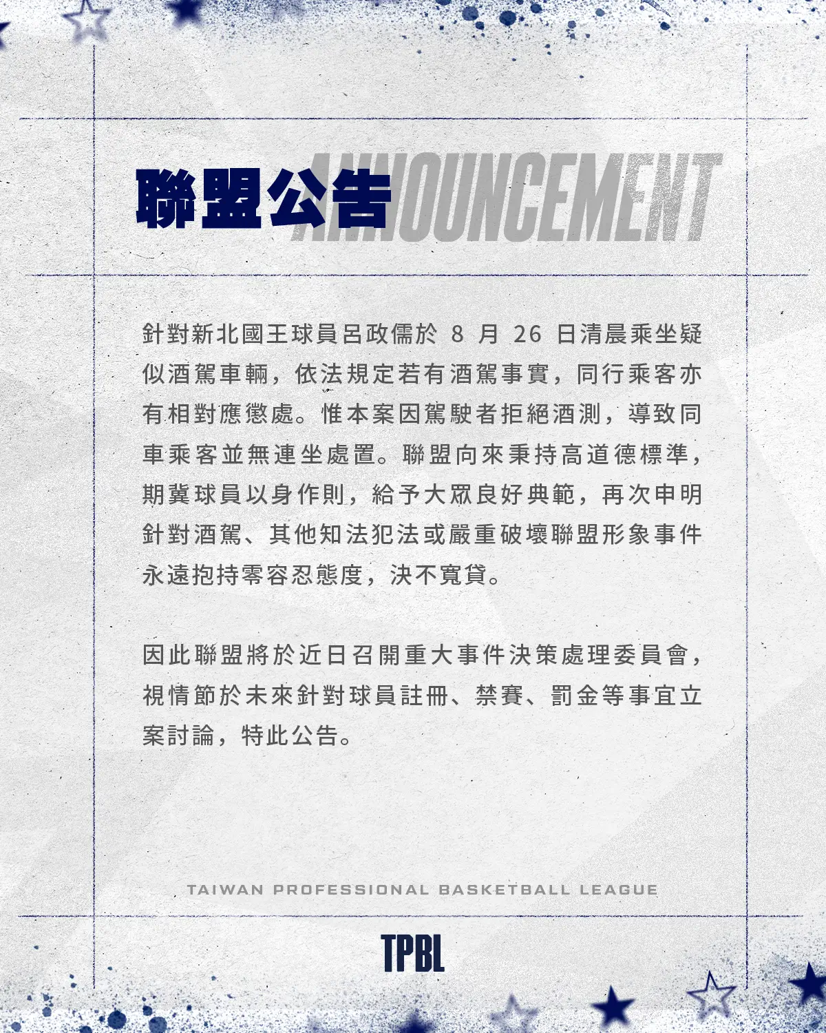 針對新北國王球員呂政儒於8月26日清晨乘坐酒駕車輛,本次事件因當事人事後自白酒駕,新北國王球員呂政儒未盡提醒義務,然事情發生之時聯盟尚未公告規章,因此將此案例送交常務理事會裁罰,懲處公告如下: