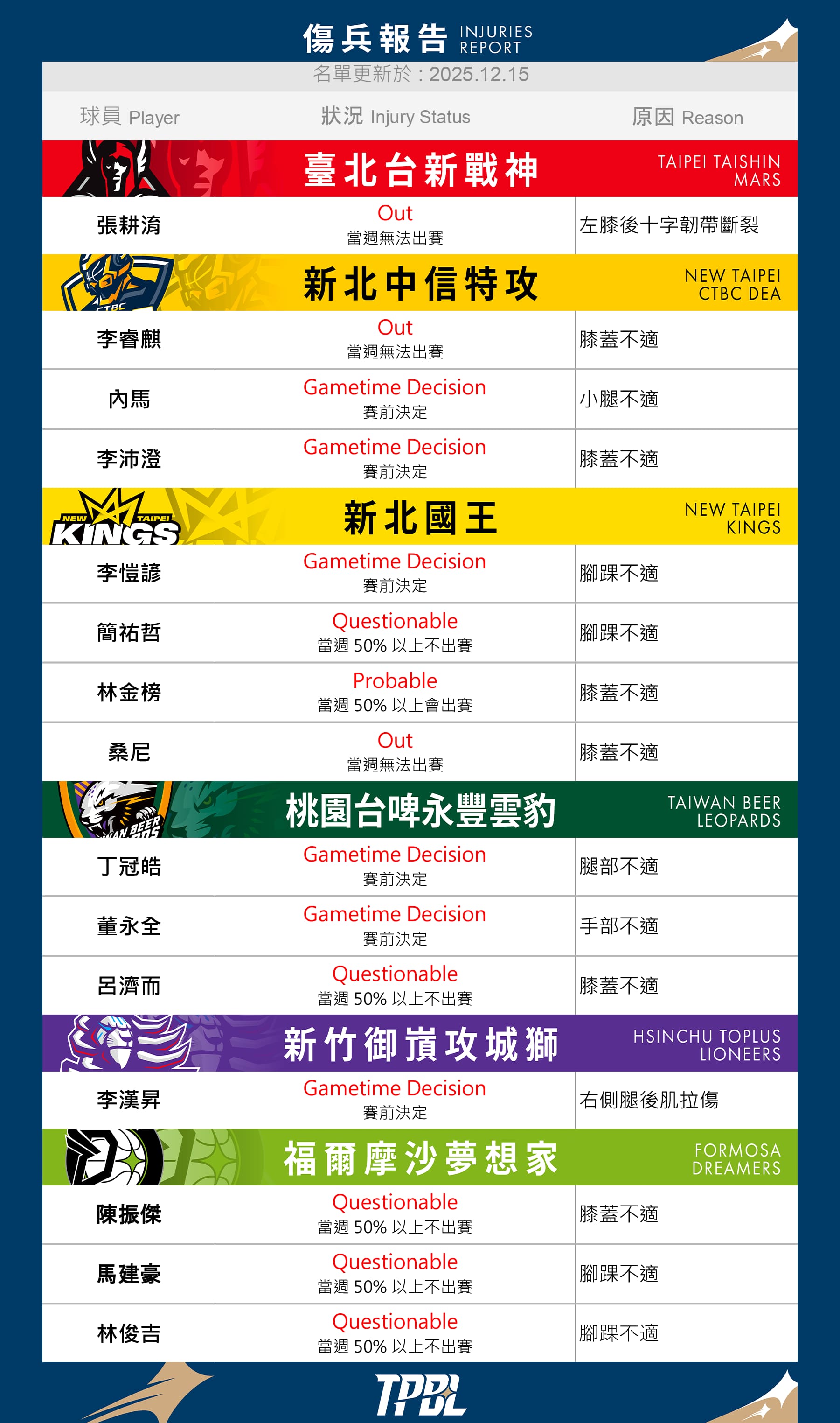 2025/12/15傷兵報告|每週一固定更新12/20 - 12/21 傷兵報告12/20-12/21 Week 10 傷兵報告 回上一頁 Related News相關新聞【一百種喜歡籃球的原因 Vol. 015】于煥亞:如果沒有籃球,我不知道人生會變成什麼樣子2025-12-12Beyond Basketball|球員故事威力斯三戰全數繳出雙十火力 率戰神主場奪兩勝並榮膺週MVP2025-12-09聯盟快訊12/13 - 12/14 傷兵報告2025-12-08傷兵報告|每週一固定更新【一百種喜歡籃球的原因 Vol. 014】江均用「拚勁」衝撞出自己的價值,帶著熱情繼續走這條未完成的籃球路2025-12-04Beyond Basketball|球員故事TPBL聖誕企劃 七隊球員翻唱經典歌曲 公益義賣12/18開跑2025-12-02聯盟快訊2025.12.02 聯盟公告2025-12-02TPBL 公告【一百種喜歡籃球的原因 Vol. 015】于煥亞:如果沒有籃球,我不知道人生會變成什麼樣子2025-12-12Beyond Basketball|球員故事威力斯三戰全數繳出雙十火力 率戰神主場奪兩勝並榮膺週MVP2025-12-09聯盟快訊12/13 - 12/14 傷兵報告2025-12-08傷兵報告|每週一固定更新【一百種喜歡籃球的原因 Vol. 014】江均用「拚勁」衝撞出自己的價值,帶著熱情繼續走這條未完成的籃球路2025-12-04Beyond Basketball|球員故事TPBL聖誕企劃 七隊球員翻唱經典歌曲 公益義賣12/18開跑2025-12-02聯盟快訊2025.12.02 聯盟公告2025-12-02TPBL 公告