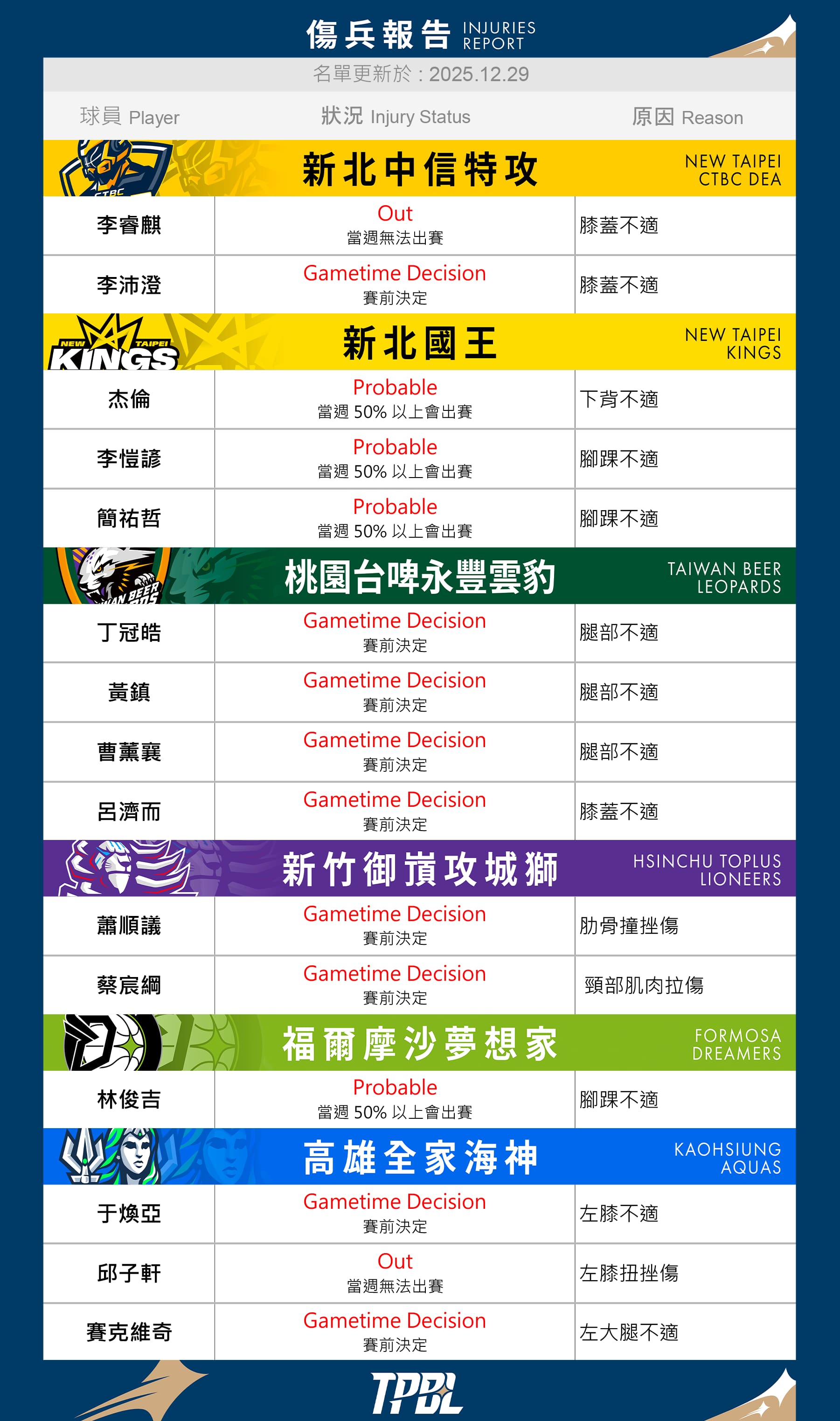 2025/12/29傷兵報告|每週一固定更新12/31 - 01/04 傷兵報告12/31-01/04 Week 12 傷兵報告 回上一頁 Related News相關新聞獅群守護神降臨! 德魯全能數據制霸全場,獲 TPBL 單週 MVP 殊榮2025-12-30聯盟快訊【一百種喜歡籃球的原因 Vol. 017】謝一謙解構比賽,建構夢想2025-12-26Beyond Basketball|球員故事比得分更多的價值 沃許本穩住禁區奪下單週MVP2025-12-23聯盟快訊12/24 - 12/28 傷兵報告2025-12-22傷兵報告|每週一固定更新2025.12.22 聯盟公告2025-12-22TPBL 公告TPBL聖誕公益義賣圓滿落幕 募得善款超過十萬2025-12-22聯盟快訊獅群守護神降臨! 德魯全能數據制霸全場,獲 TPBL 單週 MVP 殊榮2025-12-30聯盟快訊【一百種喜歡籃球的原因 Vol. 017】謝一謙解構比賽,建構夢想2025-12-26Beyond Basketball|球員故事比得分更多的價值 沃許本穩住禁區奪下單週MVP2025-12-23聯盟快訊12/24 - 12/28 傷兵報告2025-12-22傷兵報告|每週一固定更新2025.12.22 聯盟公告2025-12-22TPBL 公告TPBL聖誕公益義賣圓滿落幕 募得善款超過十萬2025-12-22聯盟快訊