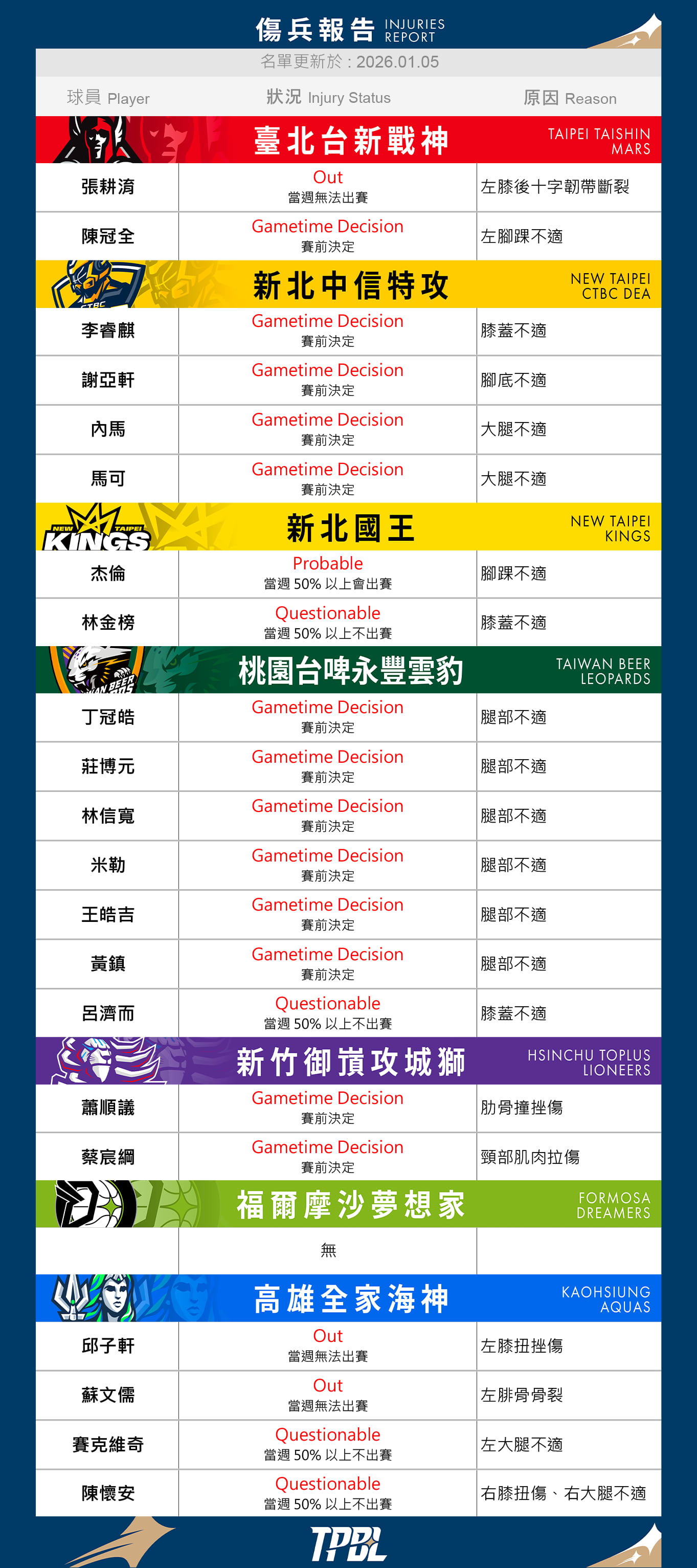 2026/01/05傷兵報告|每週一固定更新01/07 - 01/11 傷兵報告01/07-01/11 Week 13 傷兵報告 回上一頁 Related News相關新聞🏆 𝐃𝐄𝐂.|𝐏𝐥𝐚𝐲𝐞𝐫 𝐎𝐟 𝐓𝐡𝐞 𝐌𝐨𝐧𝐭𝐡 ⚡️ 新北中信特攻 謝亞軒2026-01-08聯盟快訊🏆 𝐃𝐄𝐂.|𝐏𝐥𝐚𝐲𝐞𝐫 𝐎𝐟 𝐓𝐡𝐞 𝐌𝐨𝐧𝐭𝐡 ⚡️ 新北中信特攻 馬可2026-01-08聯盟快訊2026.01.07 聯盟公告2026-01-07TPBL 公告2025.12.11 聯盟公告2025-12-11TPBL 公告迪亞洛替補挺身而出 率雲豹止敗榮膺第十二週MVP2026-01-06聯盟快訊【一百種喜歡籃球的原因 Vol. 018】從「自然」到「共好」,許時清在勝敗之間找到的教練哲學2026-01-06Beyond Basketball|球員故事🏆 𝐃𝐄𝐂.|𝐏𝐥𝐚𝐲𝐞𝐫 𝐎𝐟 𝐓𝐡𝐞 𝐌𝐨𝐧𝐭𝐡 ⚡️ 新北中信特攻 謝亞軒2026-01-08聯盟快訊🏆 𝐃𝐄𝐂.|𝐏𝐥𝐚𝐲𝐞𝐫 𝐎𝐟 𝐓𝐡𝐞 𝐌𝐨𝐧𝐭𝐡 ⚡️ 新北中信特攻 馬可2026-01-08聯盟快訊2026.01.07 聯盟公告2026-01-07TPBL 公告2025.12.11 聯盟公告2025-12-11TPBL 公告迪亞洛替補挺身而出 率雲豹止敗榮膺第十二週MVP2026-01-06聯盟快訊【一百種喜歡籃球的原因 Vol. 018】從「自然」到「共好」,許時清在勝敗之間找到的教練哲學2026-01-06Beyond Basketball|球員故事
