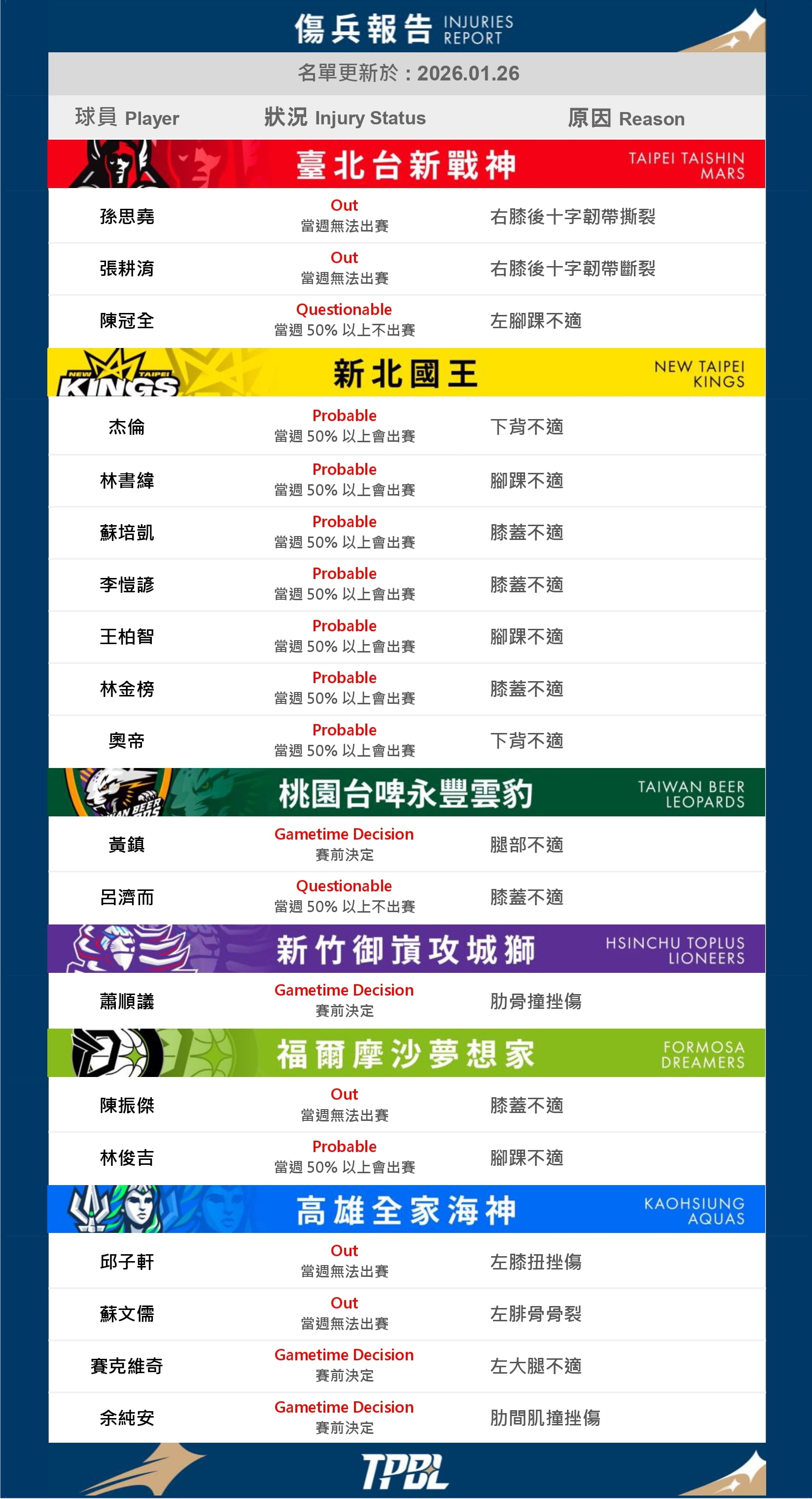 2026/01/26傷兵報告|每週一固定更新01/31 - 02/01 傷兵報告01/31-02/01 Week 16 傷兵報告 回上一頁 Related News相關新聞【一百種喜歡籃球的原因 Vol. 020】林韋翰:我不是天才,但我會走到最後2026-01-23Beyond Basketball|球員故事TPBL春節主題企劃登場 「馬喜為丟籃球」陪球迷熱鬧迎新年2026-01-21聯盟快訊火力全開領軍五連勝 高國豪飆分制勝榮膺第十四週MVP2026-01-20聯盟快訊01/24 - 01/25 傷兵報告2026-01-19傷兵報告|每週一固定更新【一百種喜歡籃球的原因 Vol. 019】雷蒙恩:從遺忘到擁抱,在信仰與血緣中找回最純粹的自己2026-01-16Beyond Basketball|球員故事2026.01.16 聯盟公告2026-01-16TPBL 公告【一百種喜歡籃球的原因 Vol. 020】林韋翰:我不是天才,但我會走到最後2026-01-23Beyond Basketball|球員故事TPBL春節主題企劃登場 「馬喜為丟籃球」陪球迷熱鬧迎新年2026-01-21聯盟快訊火力全開領軍五連勝 高國豪飆分制勝榮膺第十四週MVP2026-01-20聯盟快訊01/24 - 01/25 傷兵報告2026-01-19傷兵報告|每週一固定更新【一百種喜歡籃球的原因 Vol. 019】雷蒙恩:從遺忘到擁抱,在信仰與血緣中找回最純粹的自己2026-01-16Beyond Basketball|球員故事2026.01.16 聯盟公告2026-01-16TPBL 公告