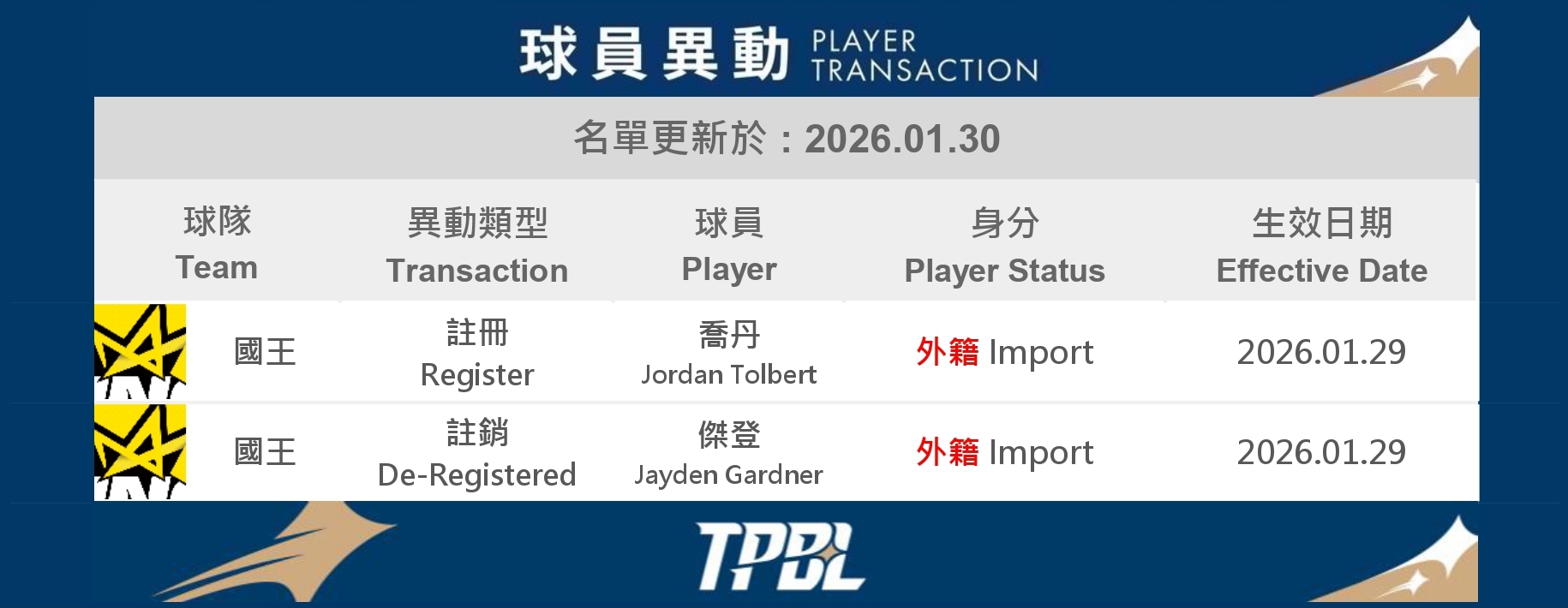 2026/01/30TPBL 公告2026.01.30 球員異動01/30 球員異動 回上一頁 Related News相關新聞【一百種喜歡籃球的原因 Vol. 029】顏行書:站在場邊,我仍然在打同一場球2026-04-03Beyond Basketball|球員故事不靠外線照樣贏 德魯全面影響戰局奪週MVP2026-03-31聯盟快訊【一百種喜歡籃球的原因 Vol. 028】陳紫柔:跨越文化與國界,在世界舞台寫下亞洲球員的新可能2026-03-31Beyond Basketball|球員故事04/01 - 04/05 傷兵報告2026-03-30傷兵報告|每週一固定更新【Nothing But Same Love】雷蒙恩 x 宋佩欣:從加州到台灣 因為籃球成為彼此的家人2026-03-25Beyond Basketball|球員故事「夢想詹姆斯」外線火燙全面宰制 班提爾32分領軍奪單週MVP2026-03-24聯盟快訊【一百種喜歡籃球的原因 Vol. 029】顏行書:站在場邊,我仍然在打同一場球2026-04-03Beyond Basketball|球員故事不靠外線照樣贏 德魯全面影響戰局奪週MVP2026-03-31聯盟快訊【一百種喜歡籃球的原因 Vol. 028】陳紫柔:跨越文化與國界,在世界舞台寫下亞洲球員的新可能2026-03-31Beyond Basketball|球員故事04/01 - 04/05 傷兵報告2026-03-30傷兵報告|每週一固定更新【Nothing But Same Love】雷蒙恩 x 宋佩欣:從加州到台灣 因為籃球成為彼此的家人2026-03-25Beyond Basketball|球員故事「夢想詹姆斯」外線火燙全面宰制 班提爾32分領軍奪單週MVP2026-03-24聯盟快訊