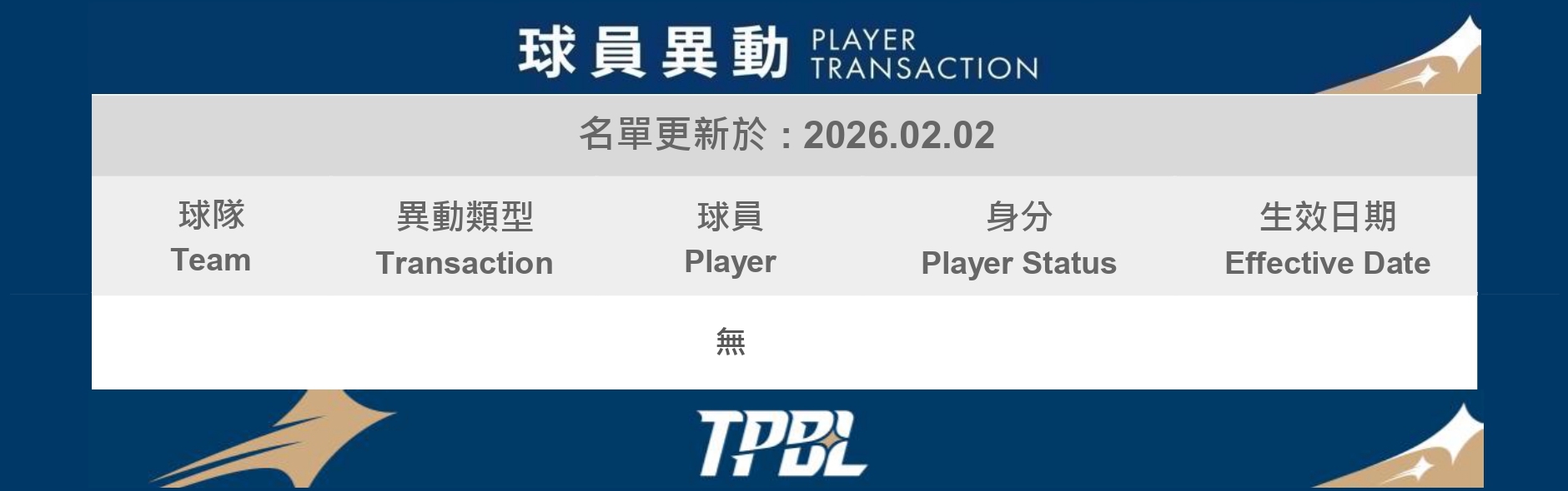 2026/02/02TPBL 公告2026.02.02 球員異動02/02 球員異動 回上一頁 Related News相關新聞36 分轟破魔鬼主場 林書緯率國王南下取勝奪週MVP2026-02-03聯盟快訊02/07 - 02/08 傷兵報告2026-02-02傷兵報告|每週一固定更新【一百種喜歡籃球的原因 Vol. 021】余涵:籃球是鑰匙,打開了人生道路2026-01-30Beyond Basketball|球員故事2026.01.30 球員異動2026-01-30TPBL 公告「新戰神」梅克迅速接管戰局 32 分全能演出率戰神踢館奪勝2026-01-27聯盟快訊01/31 - 02/01 傷兵報告2026-01-26傷兵報告|每週一固定更新36 分轟破魔鬼主場 林書緯率國王南下取勝奪週MVP2026-02-03聯盟快訊02/07 - 02/08 傷兵報告2026-02-02傷兵報告|每週一固定更新【一百種喜歡籃球的原因 Vol. 021】余涵:籃球是鑰匙,打開了人生道路2026-01-30Beyond Basketball|球員故事2026.01.30 球員異動2026-01-30TPBL 公告「新戰神」梅克迅速接管戰局 32 分全能演出率戰神踢館奪勝2026-01-27聯盟快訊01/31 - 02/01 傷兵報告2026-01-26傷兵報告|每週一固定更新