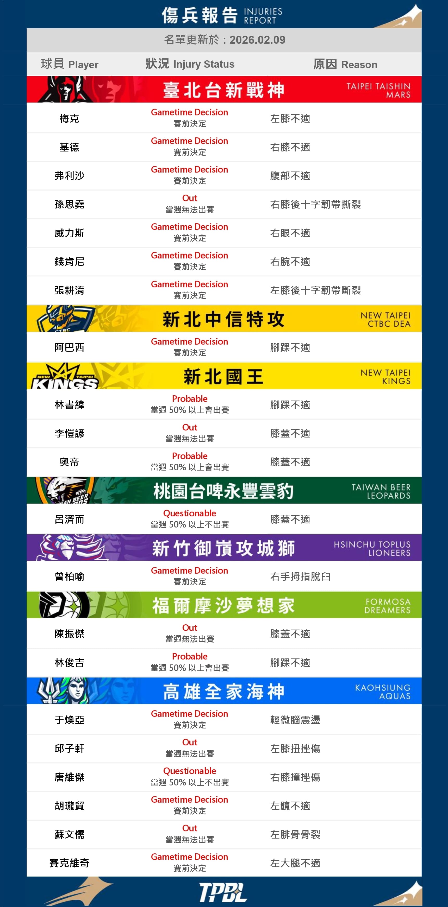 2026/02/09傷兵報告|每週一固定更新02/11 - 02/15 傷兵報告02/11-02/15 Week 18 傷兵報告 回上一頁 Related News相關新聞「夢想家詹姆斯」發威 班提爾27分20籃板奪單週MVP2026-02-10聯盟快訊2026.02.09 球員異動2026-02-09TPBL 公告【一百種喜歡籃球的原因 Vol. 022】羅德爾:在團隊的純粹中,尋找籃球的真理2026-02-06Beyond Basketball|球員故事2026.02.06 球員異動2026-02-06TPBL 公告36 分轟破魔鬼主場 林書緯率國王南下取勝奪週MVP2026-02-03聯盟快訊2026.02.02 球員異動2026-02-02TPBL 公告「夢想家詹姆斯」發威 班提爾27分20籃板奪單週MVP2026-02-10聯盟快訊2026.02.09 球員異動2026-02-09TPBL 公告【一百種喜歡籃球的原因 Vol. 022】羅德爾:在團隊的純粹中,尋找籃球的真理2026-02-06Beyond Basketball|球員故事2026.02.06 球員異動2026-02-06TPBL 公告36 分轟破魔鬼主場 林書緯率國王南下取勝奪週MVP2026-02-03聯盟快訊2026.02.02 球員異動2026-02-02TPBL 公告