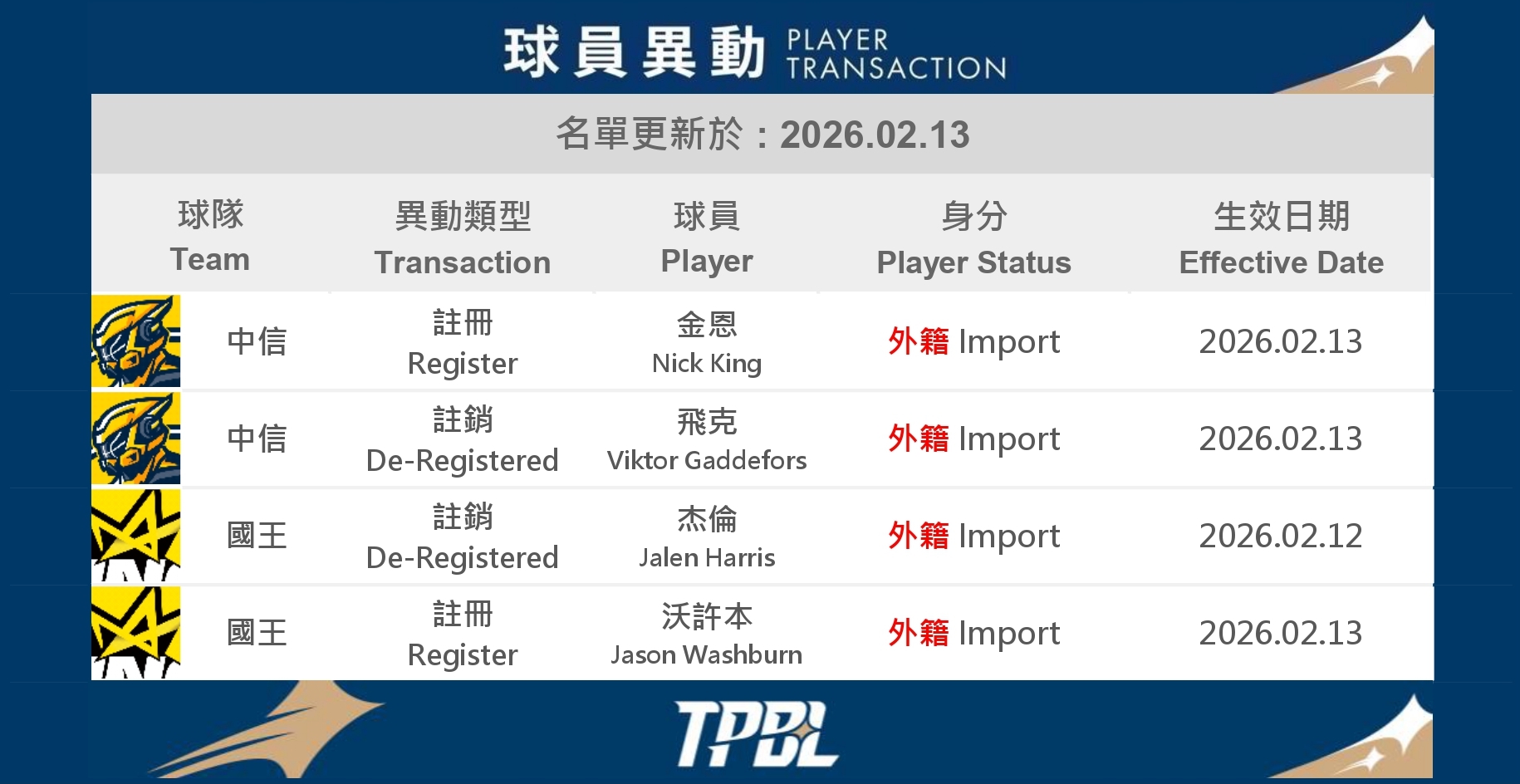 2026/02/13TPBL 公告2026.02.13 球員異動02/13 球員異動 回上一頁 Related News相關新聞【一百種喜歡籃球的原因 Vol. 023】比賽如遊戲,挫折當升級,謝銘駿的職籃「闖關」修煉2026-02-13Beyond Basketball|球員故事2026.02.12 聯盟公告2026-02-12TPBL 公告「夢想家詹姆斯」發威 班提爾27分20籃板奪單週MVP2026-02-10聯盟快訊02/11 - 02/15 傷兵報告2026-02-09傷兵報告|每週一固定更新2026.02.09 球員異動2026-02-09TPBL 公告【一百種喜歡籃球的原因 Vol. 022】羅德爾:在團隊的純粹中,尋找籃球的真理2026-02-06Beyond Basketball|球員故事【一百種喜歡籃球的原因 Vol. 023】比賽如遊戲,挫折當升級,謝銘駿的職籃「闖關」修煉2026-02-13Beyond Basketball|球員故事2026.02.12 聯盟公告2026-02-12TPBL 公告「夢想家詹姆斯」發威 班提爾27分20籃板奪單週MVP2026-02-10聯盟快訊02/11 - 02/15 傷兵報告2026-02-09傷兵報告|每週一固定更新2026.02.09 球員異動2026-02-09TPBL 公告【一百種喜歡籃球的原因 Vol. 022】羅德爾:在團隊的純粹中,尋找籃球的真理2026-02-06Beyond Basketball|球員故事