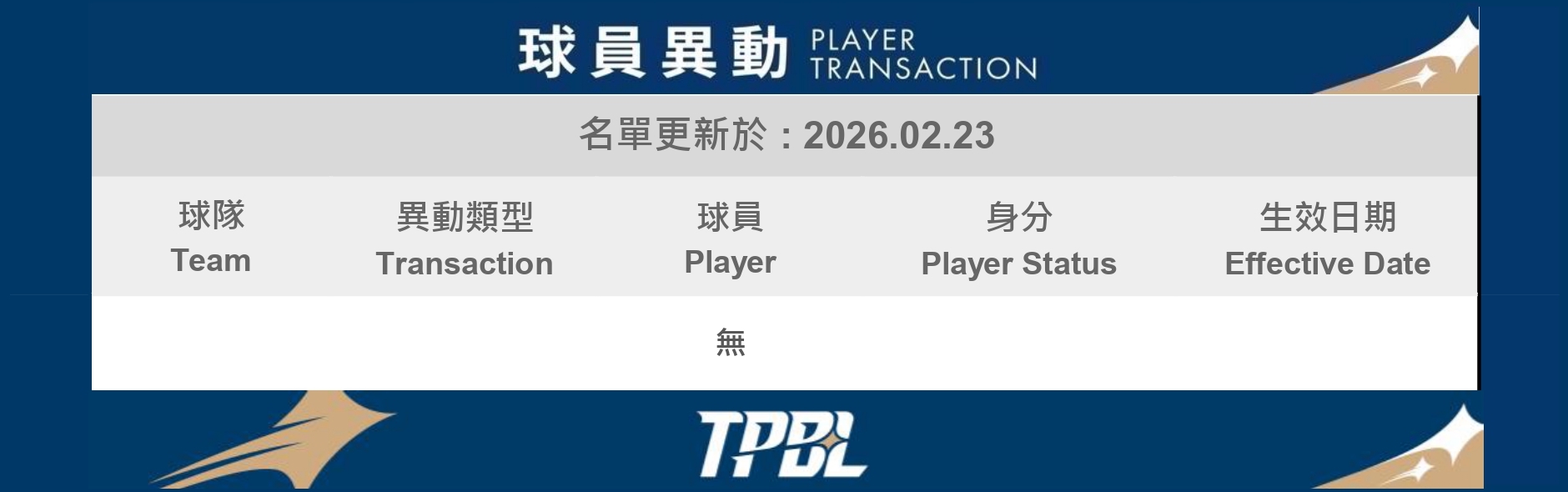 2026/02/23TPBL 公告2026.02.23 球員異動02/23 球員異動 回上一頁 Related News相關新聞🏆 𝐉𝐀𝐍. - 𝐅𝐄𝐁.|𝐏𝐥𝐚𝐲𝐞𝐫 𝐎𝐟 𝐓𝐡𝐞 𝐌𝐨𝐧𝐭𝐡 🐆 桃園台啤永豐雲豹 高錦瑋2026-02-23聯盟快訊🏆 𝐉𝐀𝐍. - 𝐅𝐄𝐁.|𝐏𝐥𝐚𝐲𝐞𝐫 𝐎𝐟 𝐓𝐡𝐞 𝐌𝐨𝐧𝐭𝐡 🛡️ 臺北台新戰神 梅克 Makur Maker2026-02-23聯盟快訊2026.02.20 球員異動2026-02-20TPBL 公告完美展現領袖價值 高錦瑋獲第十八週MVP2026-02-16聯盟快訊2026.02.16 球員異動2026-02-16TPBL 公告2026.02.13 球員異動2026-02-13TPBL 公告🏆 𝐉𝐀𝐍. - 𝐅𝐄𝐁.|𝐏𝐥𝐚𝐲𝐞𝐫 𝐎𝐟 𝐓𝐡𝐞 𝐌𝐨𝐧𝐭𝐡 🐆 桃園台啤永豐雲豹 高錦瑋2026-02-23聯盟快訊🏆 𝐉𝐀𝐍. - 𝐅𝐄𝐁.|𝐏𝐥𝐚𝐲𝐞𝐫 𝐎𝐟 𝐓𝐡𝐞 𝐌𝐨𝐧𝐭𝐡 🛡️ 臺北台新戰神 梅克 Makur Maker2026-02-23聯盟快訊2026.02.20 球員異動2026-02-20TPBL 公告完美展現領袖價值 高錦瑋獲第十八週MVP2026-02-16聯盟快訊2026.02.16 球員異動2026-02-16TPBL 公告2026.02.13 球員異動2026-02-13TPBL 公告