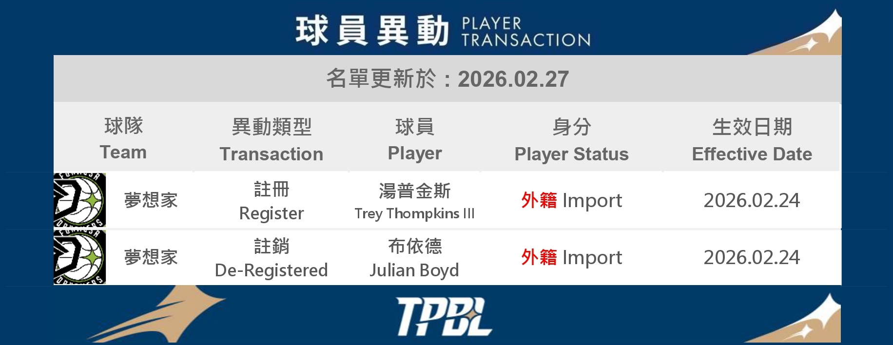 2026/02/27TPBL 公告2026.02.27 球員異動02/27 球員異動 回上一頁 Related News相關新聞2026.02.23 球員異動2026-02-23TPBL 公告🏆 𝐉𝐀𝐍. - 𝐅𝐄𝐁.|𝐏𝐥𝐚𝐲𝐞𝐫 𝐎𝐟 𝐓𝐡𝐞 𝐌𝐨𝐧𝐭𝐡 🐆 桃園台啤永豐雲豹 高錦瑋2026-02-23聯盟快訊🏆 𝐉𝐀𝐍. - 𝐅𝐄𝐁.|𝐏𝐥𝐚𝐲𝐞𝐫 𝐎𝐟 𝐓𝐡𝐞 𝐌𝐨𝐧𝐭𝐡 🛡️ 臺北台新戰神 梅克 Makur Maker2026-02-23聯盟快訊2026.02.20 球員異動2026-02-20TPBL 公告完美展現領袖價值 高錦瑋獲第十八週MVP2026-02-16聯盟快訊2026.02.16 球員異動2026-02-16TPBL 公告2026.02.23 球員異動2026-02-23TPBL 公告🏆 𝐉𝐀𝐍. - 𝐅𝐄𝐁.|𝐏𝐥𝐚𝐲𝐞𝐫 𝐎𝐟 𝐓𝐡𝐞 𝐌𝐨𝐧𝐭𝐡 🐆 桃園台啤永豐雲豹 高錦瑋2026-02-23聯盟快訊🏆 𝐉𝐀𝐍. - 𝐅𝐄𝐁.|𝐏𝐥𝐚𝐲𝐞𝐫 𝐎𝐟 𝐓𝐡𝐞 𝐌𝐨𝐧𝐭𝐡 🛡️ 臺北台新戰神 梅克 Makur Maker2026-02-23聯盟快訊2026.02.20 球員異動2026-02-20TPBL 公告完美展現領袖價值 高錦瑋獲第十八週MVP2026-02-16聯盟快訊2026.02.16 球員異動2026-02-16TPBL 公告