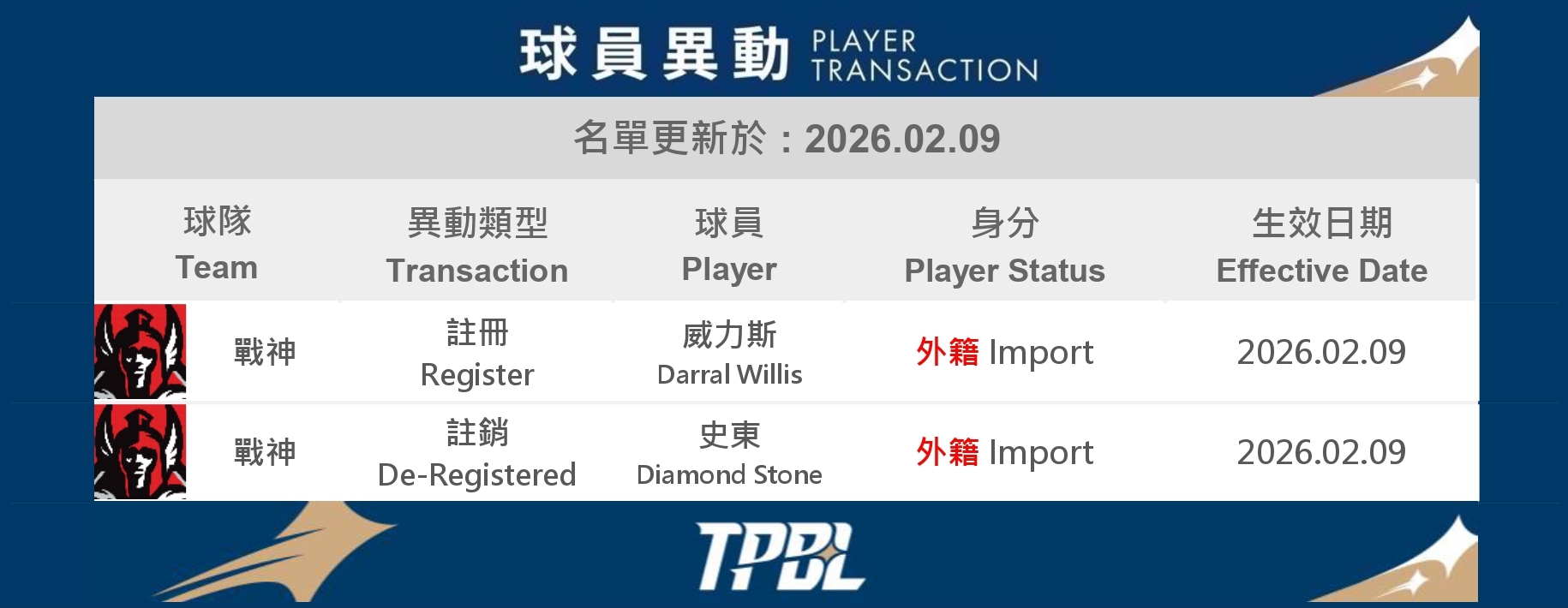 2026/02/09TPBL 公告2026.02.09 球員異動02/09 球員異動 回上一頁 Related News相關新聞2026.03.06 球員異動2026-03-06TPBL 公告2026.02.06 球員異動2026-02-06TPBL 公告【Nothing But Same Love】林信寬 x 徐詩涵:同心逐夢,籃球沒有界線2026-03-04Beyond Basketball|球員故事TPBL 宣布 INMORIES 成為官方合作夥伴 攜手打造聯盟商品 進軍臺北時裝周展現籃球時尚新篇章2026-03-03聯盟快訊03/04 - 03/08 傷兵報告2026-03-02傷兵報告|每週一固定更新2026.03.02 球員異動2026-03-02TPBL 公告2026.03.06 球員異動2026-03-06TPBL 公告2026.02.06 球員異動2026-02-06TPBL 公告【Nothing But Same Love】林信寬 x 徐詩涵:同心逐夢,籃球沒有界線2026-03-04Beyond Basketball|球員故事TPBL 宣布 INMORIES 成為官方合作夥伴 攜手打造聯盟商品 進軍臺北時裝周展現籃球時尚新篇章2026-03-03聯盟快訊03/04 - 03/08 傷兵報告2026-03-02傷兵報告|每週一固定更新2026.03.02 球員異動2026-03-02TPBL 公告