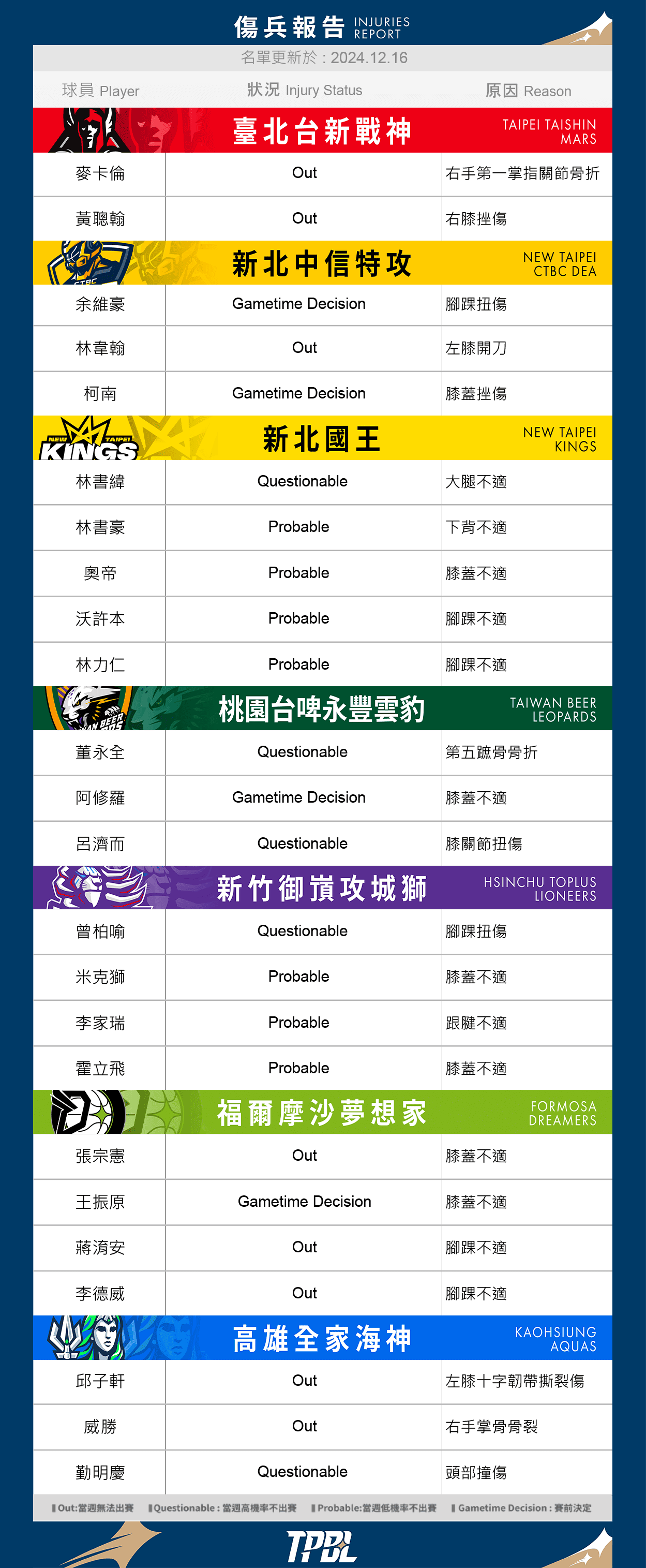 2024/12/16傷兵報告|每週一固定更新WEEK 8 傷兵報告Week 8 傷兵報告 回上一頁 Related News相關新聞【一百種喜歡籃球的原因 Vol. 014】江均用「拚勁」衝撞出自己的價值,帶著熱情繼續走這條未完成的籃球路2025-12-04Beyond Basketball|球員故事TPBL聖誕企劃 七隊球員翻唱經典歌曲 公益義賣12/18開跑2025-12-02聯盟快訊2025.12.02 聯盟公告2025-12-02TPBL 公告12/03 - 12/07 傷兵報告2025-12-01傷兵報告|每週一固定更新🏆𝑶𝑪𝑻.-𝑵𝑶𝑽.|𝑷𝒍𝒂𝒚𝒆𝒓 𝑶𝒇 𝑻𝒉𝒆 𝑴𝒐𝒏𝒕𝒉 🐆桃園台啤永豐雲豹 高錦瑋2025-11-30聯盟快訊🏆𝑶𝑪𝑻.-𝑵𝑶𝑽.|𝑷𝒍𝒂𝒚𝒆𝒓 𝑶𝒇 𝑻𝒉𝒆 𝑴𝒐𝒏𝒕𝒉 🐆桃園台啤永豐雲豹 克羅馬2025-11-30聯盟快訊【一百種喜歡籃球的原因 Vol. 014】江均用「拚勁」衝撞出自己的價值,帶著熱情繼續走這條未完成的籃球路2025-12-04Beyond Basketball|球員故事TPBL聖誕企劃 七隊球員翻唱經典歌曲 公益義賣12/18開跑2025-12-02聯盟快訊2025.12.02 聯盟公告2025-12-02TPBL 公告12/03 - 12/07 傷兵報告2025-12-01傷兵報告|每週一固定更新🏆𝑶𝑪𝑻.-𝑵𝑶𝑽.|𝑷𝒍𝒂𝒚𝒆𝒓 𝑶𝒇 𝑻𝒉𝒆 𝑴𝒐𝒏𝒕𝒉 🐆桃園台啤永豐雲豹 高錦瑋2025-11-30聯盟快訊🏆𝑶𝑪𝑻.-𝑵𝑶𝑽.|𝑷𝒍𝒂𝒚𝒆𝒓 𝑶𝒇 𝑻𝒉𝒆 𝑴𝒐𝒏𝒕𝒉 🐆桃園台啤永豐雲豹 克羅馬2025-11-30聯盟快訊