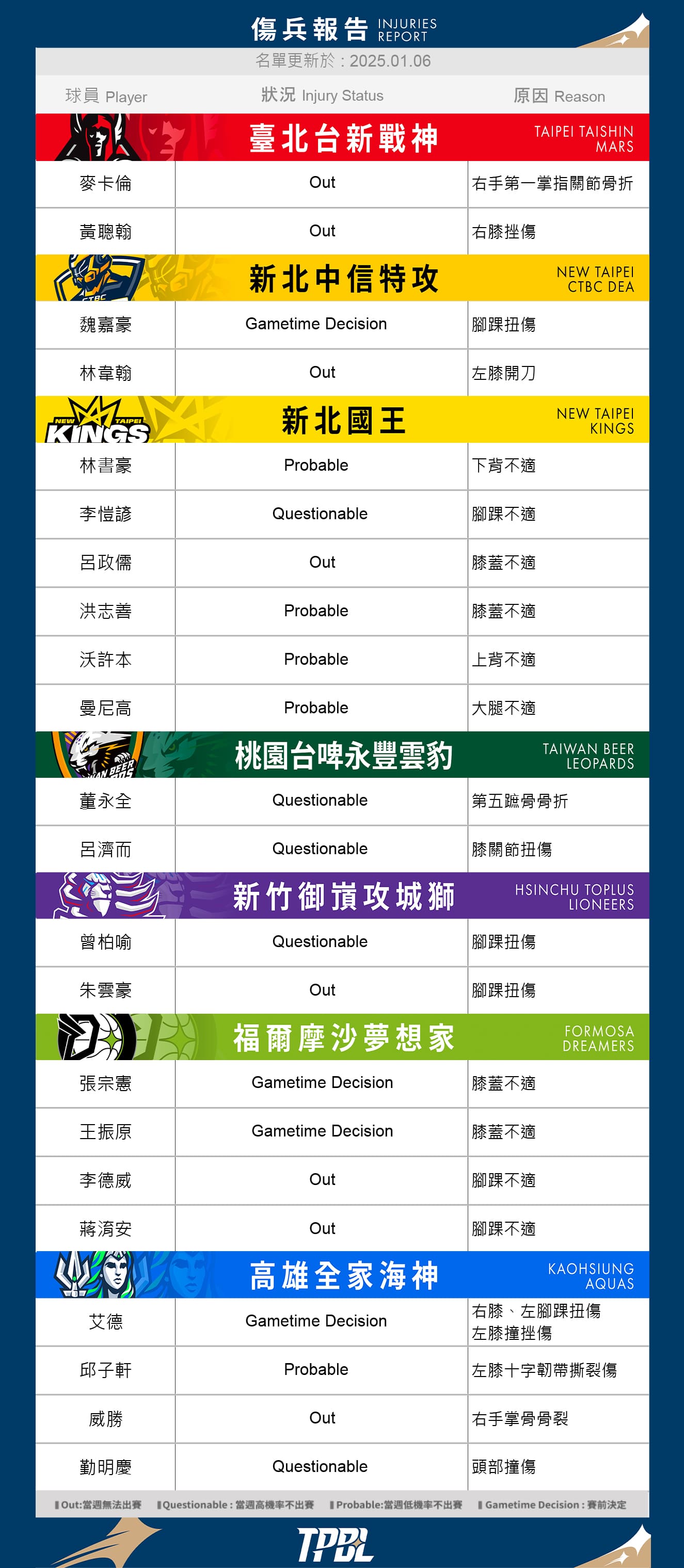 2025/01/06傷兵報告|每週一固定更新WEEK 11 傷兵報告Week 11 傷兵報告 回上一頁 Related News相關新聞【一百種喜歡籃球的原因 Vol. 014】江均用「拚勁」衝撞出自己的價值,帶著熱情繼續走這條未完成的籃球路2025-12-04Beyond Basketball|球員故事TPBL聖誕企劃 七隊球員翻唱經典歌曲 公益義賣12/18開跑2025-12-02聯盟快訊2025.12.02 聯盟公告2025-12-02TPBL 公告12/03 - 12/07 傷兵報告2025-12-01傷兵報告|每週一固定更新🏆𝑶𝑪𝑻.-𝑵𝑶𝑽.|𝑷𝒍𝒂𝒚𝒆𝒓 𝑶𝒇 𝑻𝒉𝒆 𝑴𝒐𝒏𝒕𝒉 🐆桃園台啤永豐雲豹 高錦瑋2025-11-30聯盟快訊🏆𝑶𝑪𝑻.-𝑵𝑶𝑽.|𝑷𝒍𝒂𝒚𝒆𝒓 𝑶𝒇 𝑻𝒉𝒆 𝑴𝒐𝒏𝒕𝒉 🐆桃園台啤永豐雲豹 克羅馬2025-11-30聯盟快訊【一百種喜歡籃球的原因 Vol. 014】江均用「拚勁」衝撞出自己的價值,帶著熱情繼續走這條未完成的籃球路2025-12-04Beyond Basketball|球員故事TPBL聖誕企劃 七隊球員翻唱經典歌曲 公益義賣12/18開跑2025-12-02聯盟快訊2025.12.02 聯盟公告2025-12-02TPBL 公告12/03 - 12/07 傷兵報告2025-12-01傷兵報告|每週一固定更新🏆𝑶𝑪𝑻.-𝑵𝑶𝑽.|𝑷𝒍𝒂𝒚𝒆𝒓 𝑶𝒇 𝑻𝒉𝒆 𝑴𝒐𝒏𝒕𝒉 🐆桃園台啤永豐雲豹 高錦瑋2025-11-30聯盟快訊🏆𝑶𝑪𝑻.-𝑵𝑶𝑽.|𝑷𝒍𝒂𝒚𝒆𝒓 𝑶𝒇 𝑻𝒉𝒆 𝑴𝒐𝒏𝒕𝒉 🐆桃園台啤永豐雲豹 克羅馬2025-11-30聯盟快訊